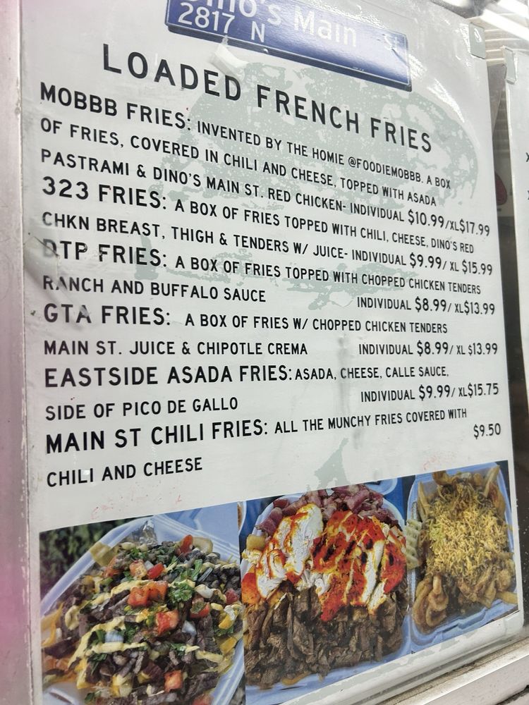 The homie foodiemobbb created his own plate! A large order of fries topped with chili, cheese, pastrami, carne asada and Dino's Main St. grilled chicken breast. It's a gang of food! Add-ons are available for an additional charge.